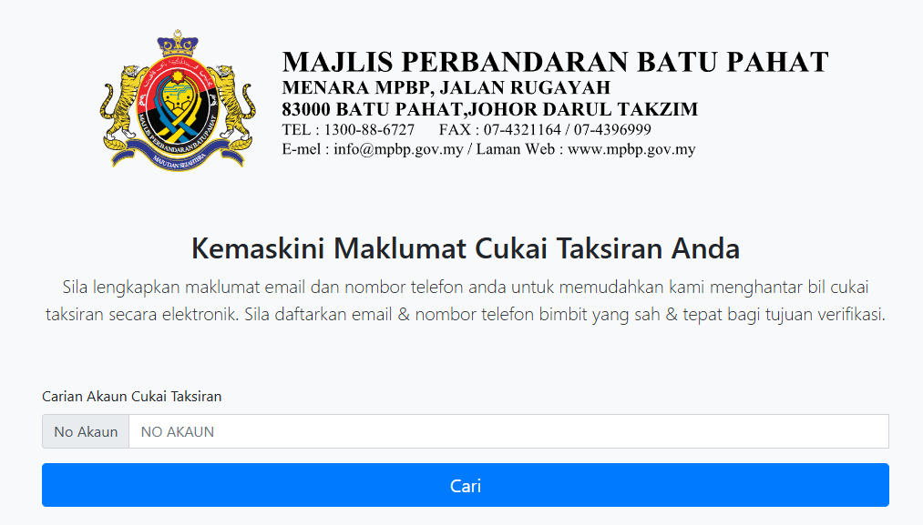 Semua pemilik harta yang berada di dalam kawasan MPBP digalakkan untuk mengemaskini maklumat Akaun Cukai Harta melalui pautan http://mpbp.pbtbill.net